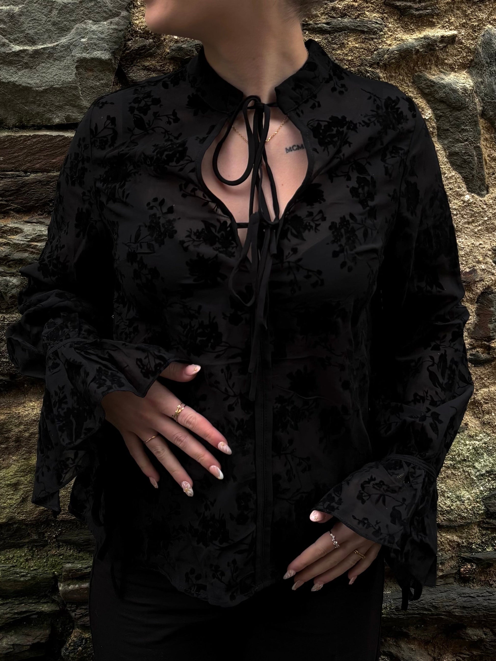 Ce chemisier noir transparent séduit par son jeu de matières raffiné. Orné de fleurs en effet velours, il apporte relief et sophistication tout en laissant apparaître la peau avec délicatesse. Une pièce chic et tendance, idéale pour sublimer une tenue de jour comme de soirée.